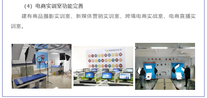 建有商品摄影实训室、新媒体营销实训室、跨境电商实战室、电商直播实训室。